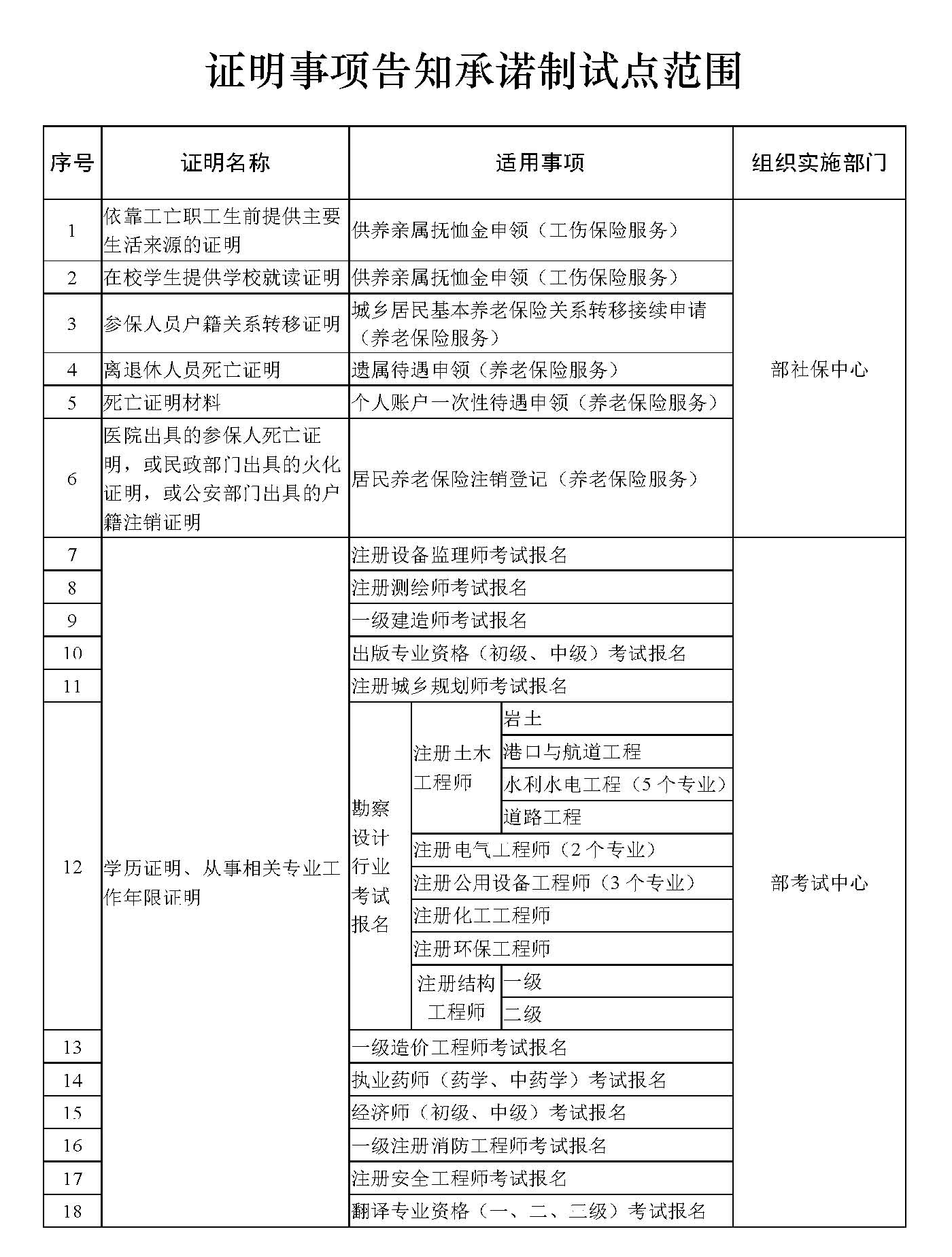 根據(jù)現(xiàn)有工作基礎(chǔ),確定在6項(xiàng)社會(huì)保險(xiǎn)經(jīng)辦業(yè)務(wù)和12項(xiàng)專業(yè)技術(shù)人員資格考試報(bào)名中開展證明事項(xiàng)告知承諾制試點(diǎn)(詳見附件)。